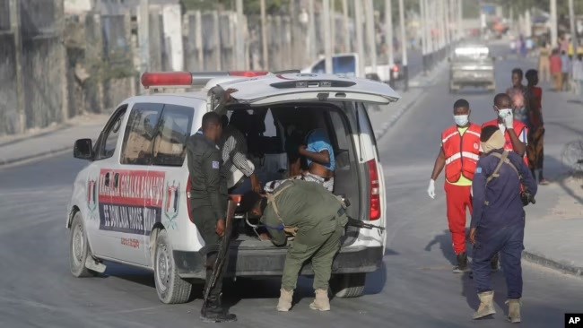 FILE - Security carry away victims injured during fighting between al-Shabab extremists and soldiers in Mogadishu, Somalia, Feb. 21, 2023.