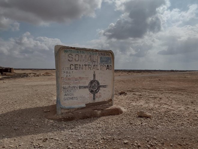 A sign post on a road between Dhusamareb and Adado in Galmudug state, central Somalia. November 2022. CRISIS GROUP / Omar Mahmood