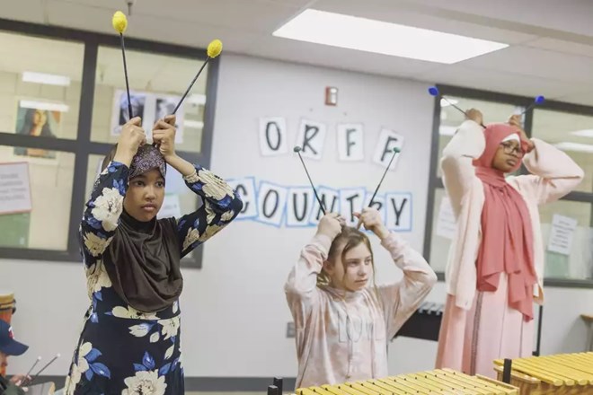 Muniira Jirde (left), Lillian Chapman (center), and Asmaa Abdi (right) show their xylophone mallets as teacher Becca Buck lectures during a music class at Gideon Pond Elementary on April 11. Kerem Yücel | MPR News