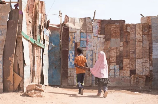 Two Ethiopian children outside their home in a shantytown in Burco, Somaliland 250km away from the disputed city of Las Anod where fighting has been ongoing since February 6 [Al Jazeera].