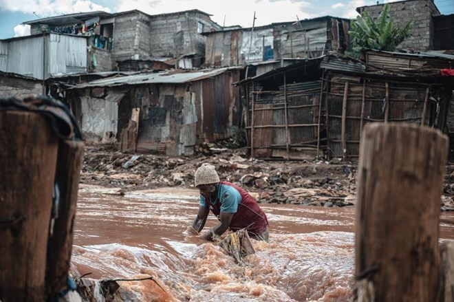 A man retrieves belongings from a flooded river in the Mathare slums in Nairobi, Kenya, on April 30, 2024. (Xinhua/Wang Guansen)