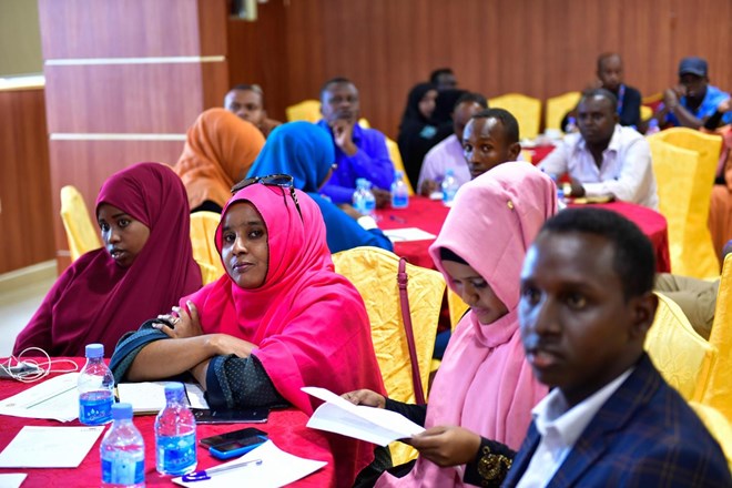 Somali youth follow proceedings at a conference between diaspora returnees and locals, Mogadishu, 2017. Illustration © Africa Collection / Alamy Stock Photo