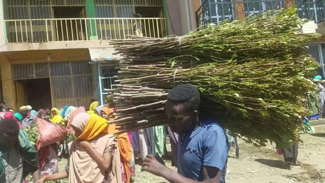 An Ethiopian worker carries a large bundle of khat, a stimulant crop that plays a vital role in the country's economy, at a local market. Khat trade disruptions have impacted farmers, traders, and regional economies.