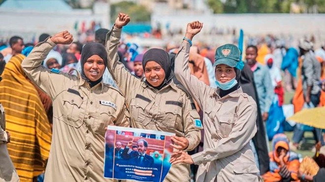 Somali police officers hold a demonstration at Eng Yariisow Stadium in Mogadishu on January 3 in support of the government against the port deal between Ethiopia and Somaliland.