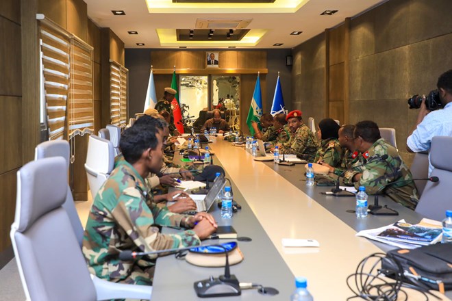 Mogadishu (HOL) - Somali President Hassan Sheikh Mohamud held a meeting with key military figures, including Somali army chief Brigadier General Ibrahim Sheikh Muhyadin, along with the commanders of the Navy and Air Force and the Deputy Commander of the Somali Land Forces at the Ministry of Defense in Mogadishu on Wednesday.