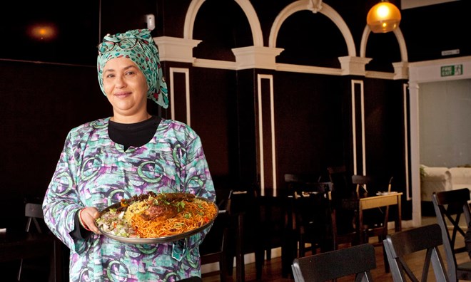 Wafted here from paradise: Foz Abdi, chef and matriarch, at Hooyos Somali Cuisine. Photograph: Sophia Evans/The Observer