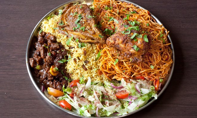You could follow that with a wrap. You could have a burger. You could have a chicken caesar. Don’t judge them. They’ve got a living to make. Also, don’t have any of these. Have one of the sharing platters. They are a bit of everything that defines Hooyos and are clearly portioned by a kitchen that only regards far too much as enough. The platter for two at £32 could easily feed three. The platter for six at £60 could presumably feed Luton. It’s built on a hefty platform of carbs that have been pelted with roasted and ground spices. To one side is a huge, tangled pile of dry, masala-spiced spaghetti, bursting with ground cumin and coriander seed and stained a deep-rust colour. Next to that comes a generous heap of equally fragrant rice. It’s fringed by a salad that’s purple-dusted with sour sumac.