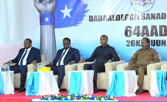 Mogadishu (HOL) — President Hassan Sheikh Mohamud attended a ceremony in Mogadishu on Tuesday to mark Somalia's 64th Independence Day. He was joined by Prime Minister Hamza Abdi Barre, Deputy Prime Minister Salah Ahmed Jama, and other senior officials. During the event, President Mohamud wished Somalis at home and abroad a joyous Independence Day.