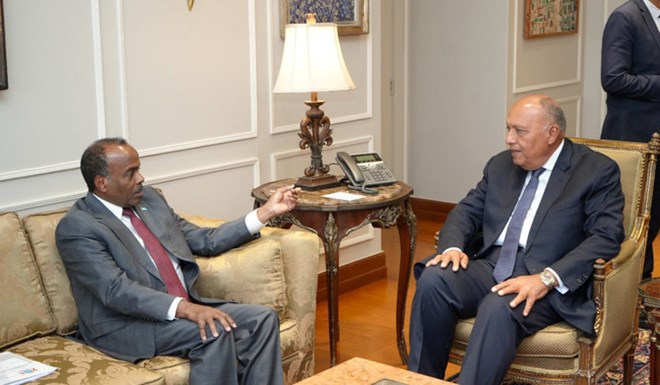 Sameh Shoukry (R) holds talks with Ali Mohamed Omar in Cairo. (Twitter @MfaEgypt)