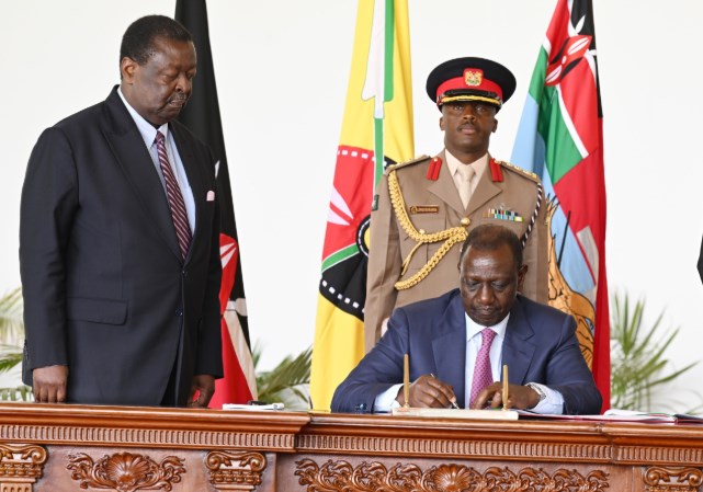 President William Ruto and Prime Cabinet Secretary and Cabinet Secretary for Foreign & Diaspora Affairs Musalia Mudavadi during the signing of the FY 2024/2025 ministerial performance contracts at State House November 19, 2024/ PCS