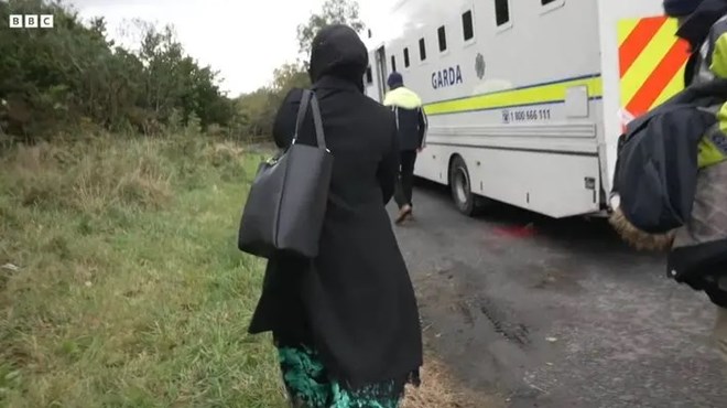 A Somali woman walks near a Garda immigration vehicle during a border inspection in Ireland, as authorities intensify efforts to curb illegal migration through Northern Ireland.