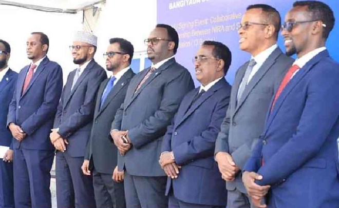 Somalia's Deputy Prime Minister Salah Jama, Central Bank Governor Abdirahman Mohamed, Nira Director General Tima'adde and other ministers pose for a photo after signing of the partnership agreement. [Courtesy Nira]