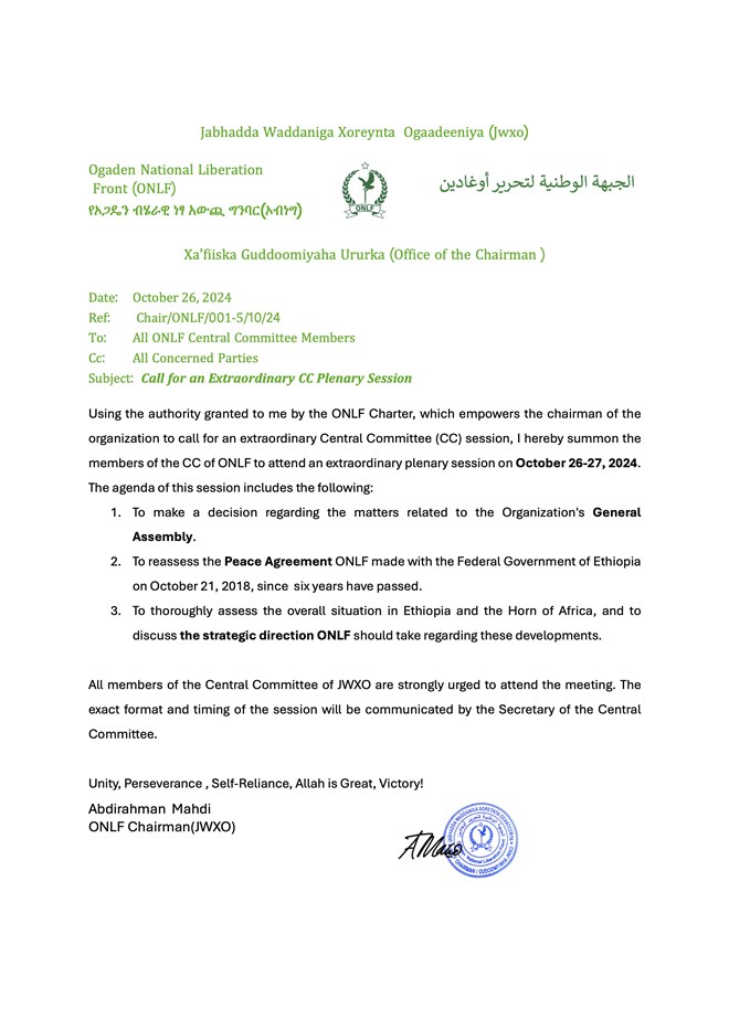 ONLF's leadership has called for an extraordinary Central Committee (CC) plenary session on October 26-27, 2024, to formally reassess the 2018 peace agreement. The meeting will address the status of the peace accord and ONLF's strategic direction amid rising tensions in the Horn of Africa.