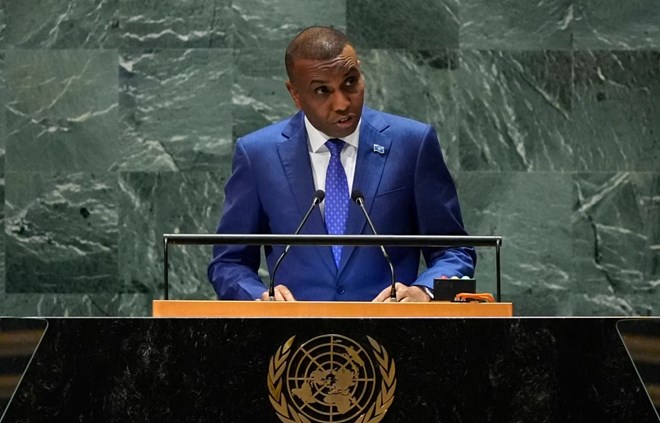FILE - Somalia's Prime Minister Hamza Abdi Barre addresses the 79th session of the United Nations General Assembly, Sept. 27, 2024.