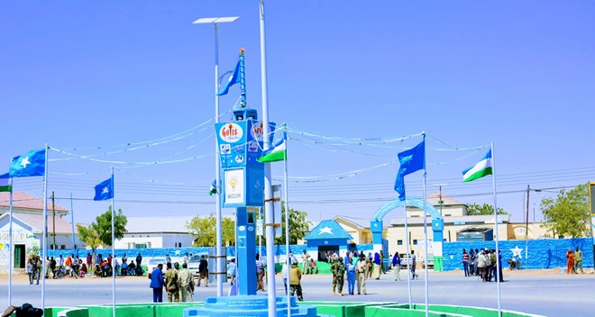 FILE - Garowe city center, Puntland, Somalia, featuring local security forces and residents around the iconic monument. Photo via Wikimedia Commons.