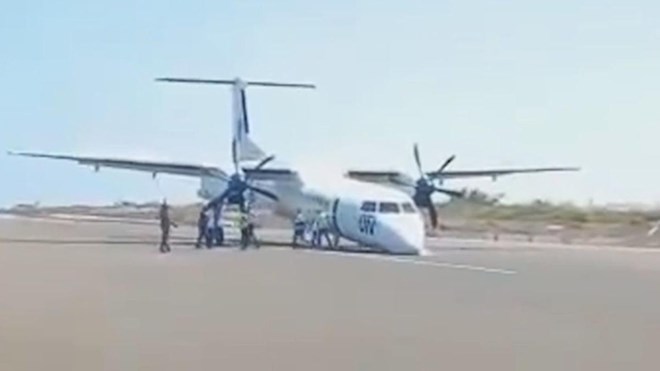UN cargo aircraft rests on its nose after a landing gear failure at Mogadishu’s Aden Adde International Airport on April 1, 2025.