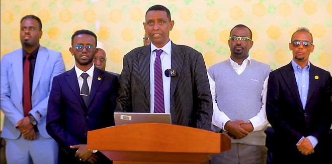 A high-level delegation from Somaliland addresses the media during a press conference in Erigavo