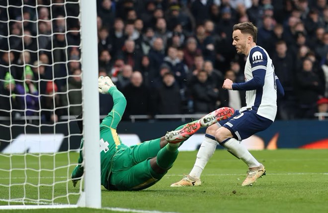 Soccer Football - Premier League - Tottenham Hotspur v Manchester United - Tottenham Hotspur Stadium, London, Britain - February 16, 2025 Tottenham Hotspur's James Maddison scores their first goal past Manchester United's Andre Onana Action Images via Reuters/Paul Childs Purchase Licensing Rights