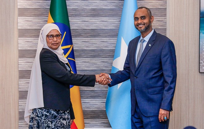 Somalia's state minister for foreign affairs, Ali Omar, confirmed Aisha Mohammed Mussa's visit in a message to Reuters but did not say what she was there to discuss.