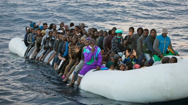 FILE - Migrants and refugees crowd aboard a rubber boat sailing out of control in the Mediterranean Sea about 21 miles north of Sabratha, Libya, Feb. 3, 2017.