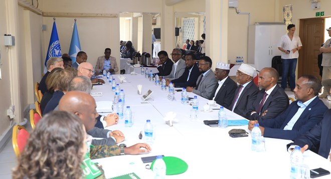 FILE - Members of the Somali Salvation Forum, a coalition of former presidents, prime ministers, and senior political leaders, meet with international partners during a high-level consultation in Mogadishu, Somalia