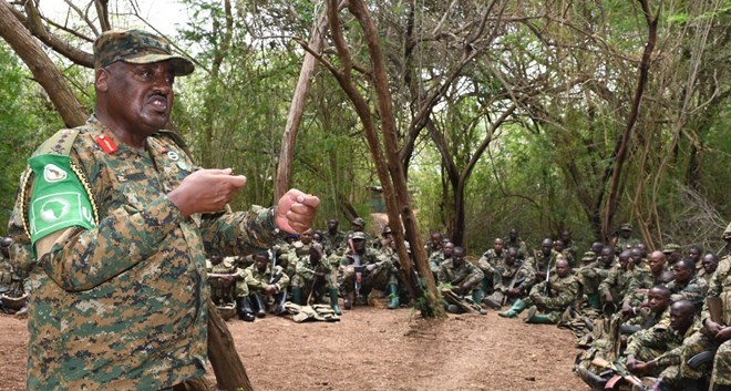 FILE – A Ugandan army officer addresses soldiers deployed under the African Union Stabilization Support Mission in Somalia (AUSSOM) during a field briefing in Somalia's Lower Shabelle region.