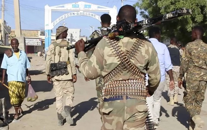 Frame grab from video shoot Wednesday, March 12, 2025, showing Somali armed forces on patrol outside where a car bomb exploded Tuesday at a hotel in the central Somali city of Beledweyne, kicking off an hourslong militant attack that killed an unknown number of people. (AP)