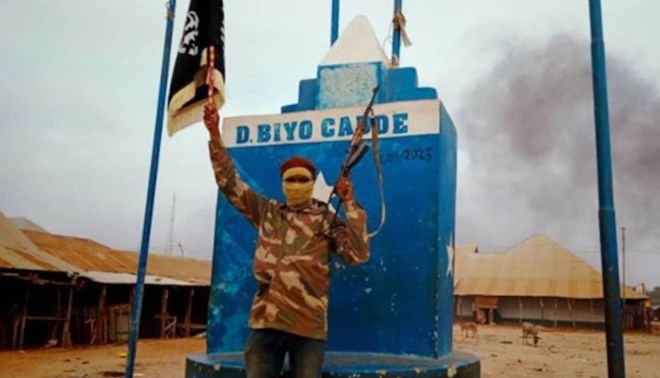 A masked Shabaab militant poses with a rifle and the group's flag in front of a landmark in Biyo Cadde, central Somalia, after the militant group claimed to have captured the town. The photo, released by Shabaab-affiliated media, comes amid a series of coordinated assaults across the Middle Shabelle region.