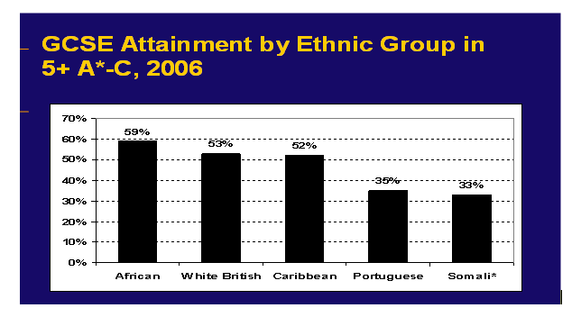 It seems Somali boys are even greater underachievers. For example, a report commissioned by London Borough of Camden notes, “In 2000 only three out of 30 Somali boys entered for GCSEs attained five or more at grades A*-C. The number of boys entered in 2002 was only 23 and of these only two gained five or more “good” GCSEs.”