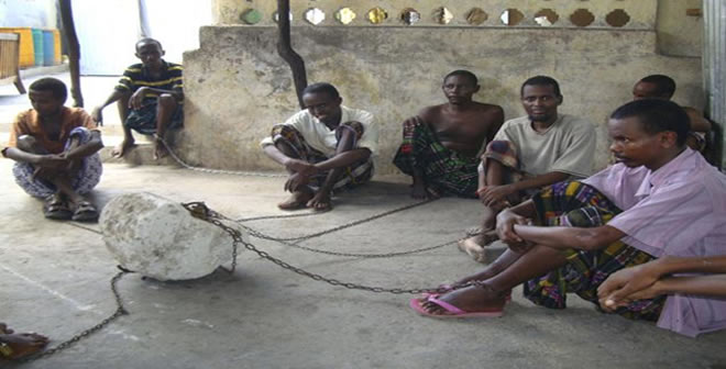 In this photo, chained mentally ill patients sit within a mental health center in Mogadishu, Somalia. Source: The Hindu