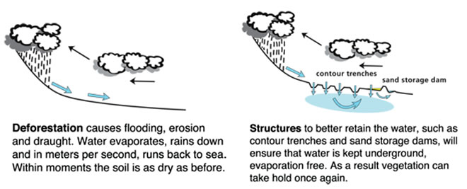 It is essential to improve the water collection capacity of soil in order to tackle desertification and soil erosion. This is achieved with the help of so-called contour trenches. These are trenches that follow the contours of the landscape and capture the rainwater flowing downwards above ground. Using these trenches, destructive above-ground water flows no longer erode the soil; wash away the fertile top soil and any vegetation still present. These trenches mean that water flows underground, resulting in the creation of an underground water supply. This underground water supply is used not only as drinking water by humans and animals, but also stimulates the growth of natural vegetation and of the agricultural crops planted.  Besides laying contour trenches, a number of other elements are introduced – stone walls and tree coppicing, for example – which optimizes the effective water-holding capacity of the flow area, erosion is stopped and regulated evaporation is responsible for the achievement of a better local and regional climate.