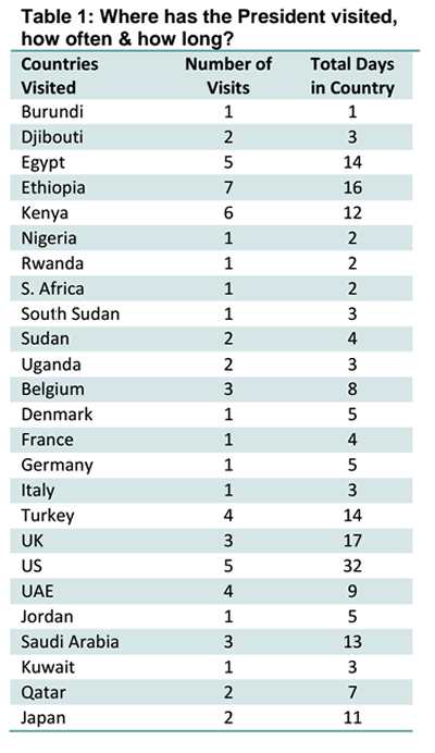 Is this characterisation of the President fair? In this article we analyse the President’s travel patterns since 2013: where he has visited, for how long, purpose and most importantly the cost and returns on these trips; and whether the funds could have been better utilised elsewhere. I compiled this information by reviewing news publications from Somali websites, which have a chronological publication of events in Somalia, including the Presidents foreign trips. I also looked at government budgets and conducted interviews with key contacts in government (past and present).