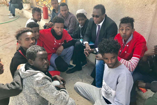 Upon arrival to Libya, we rushed to our Embassy in Tripoli and were warmly received by the charge d’affair and other staff of the Embassy. We then met with young migrants who were at the Embassy waiting for our arrival. As I listened their stories, I felt I was watching horror movies; not knowing exactly how to comfort them; the only thing I could do was to tell them what they've been through was indeed horrific and the Somali government is here to help them. They were eager to speak and share their stories; their narratives were all common namely suffering from hunger, thirsty, abuses, torture, rape, force labor, and diseases (such as scabies, Tuberculosis, etc.). On the second day of our trip, two Somali migrants from Ethiopia were brought to the Embassy with the help of other Somali migrants after being released by a smuggler/broker. They looked thin and seriously sick. Both of them were admitted to a hospital and two days later, sadly one of them passed away.