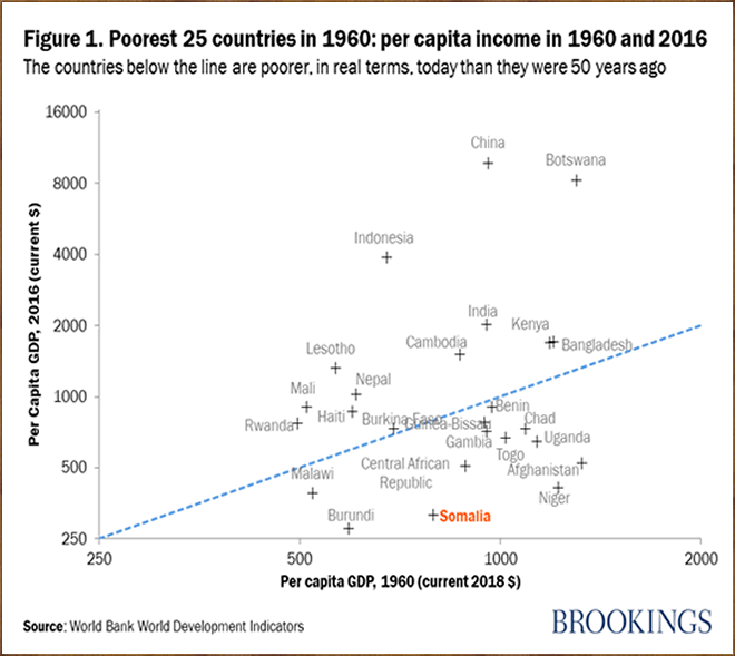 Among these nations, no country has become more impoverished relative to its position in 1960 than Somalia. Following the collapse of Siad Barre's government in 1991, a long civil war devastated the economy, infrastructure, and public institutions of the country, creating a massive loss of human capital. However, nothing has impacted the nation more than its incompetent leaders who have rigged the system and abused their powers to benefit themselves and their closed circles.