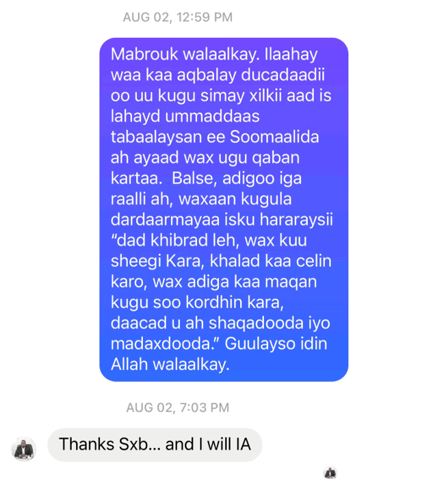 And now, let me conclude by sharing my private message to Xildhibaan Mohamud Abdirahman Beenebeene upon learning his appointment as a Minister of Planning. It is indicative of the type of relationship we share, strictly professional and learning from one another: