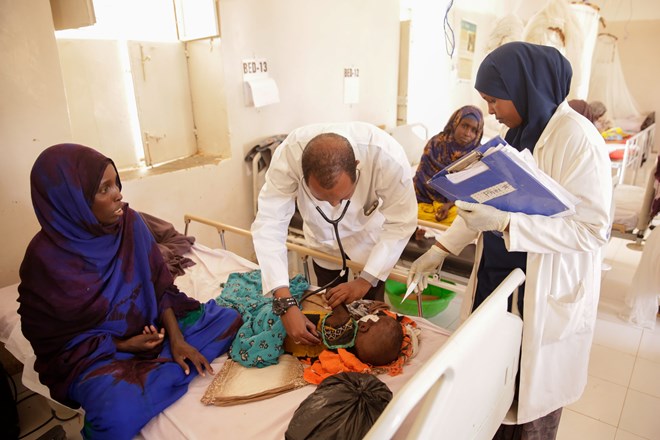 A doctor and nurse from the International Medical Corps attend to a malnourished child at Galkayo Hospital's stabilization center in Somalia.