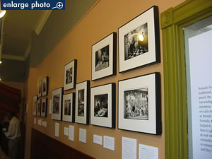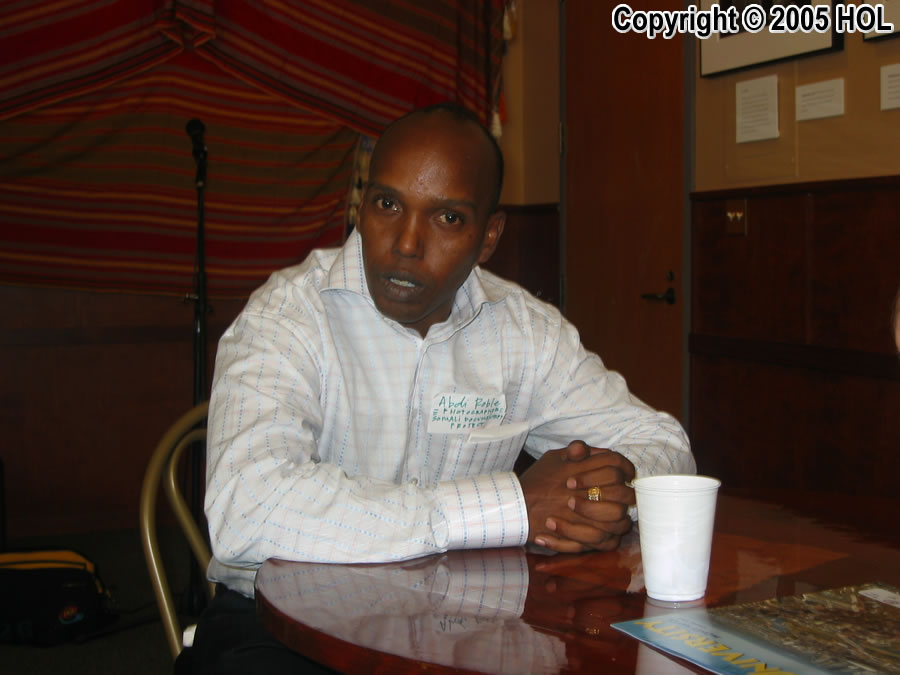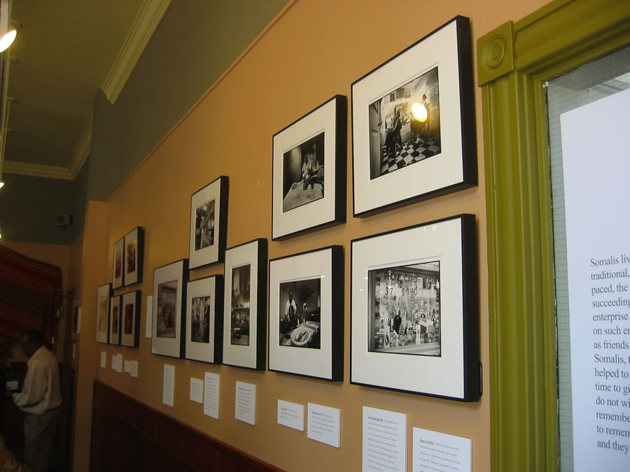 Galabtii aan ugu tagay xarunta bandhigiisa ee Minneapolis waxaan u galay isagoo eey ku hareereysan yihiin xiiseeyayaal u dhuun daloola sawirada uu Cabdi soo bandhigay, oo Mareykan u badan. Cabdi oo eey qoorta u suran tahay dhowr Kaamaro ayaa bidix iyo midig uga qosolsiinayey xiiseeyayaashaas, isagoo su’aalohooda ka jawaabaya. Darbiga waxaa ku xardhanaa sawiro caddaan iyo madow ah (Black & White) oo kala gaddisan, laakiin Somali uun ah; Waxaa iigu murugo badnaa sawir gabar yar oo taagan kaabadda aqal doqosh ah oo uga dhisan xero qoxooti oo Kenya ku taalla, sida uu Cabdi ii sharaxay. Wajigeeda waxaa ka muuqda quus, rajo la’aan, daal iyo tiiraanyo raagtay. Waxaa kaloo ka muuqda ineey la yaaban tahay aaladda lagu beegayo wajigeeda ee sawirka looga qaadayo, oo malaha eeysan-ba aqoon. Dhabarkeeda waxaa laga dheehan karaa cunug kale oo isna u fiirsanaya guuxa soo abbaaray doqoshka yar oo eey ku meel gaarka uga yihiin dunidan, walow aan wajigiisa si quman loogu jeedin.