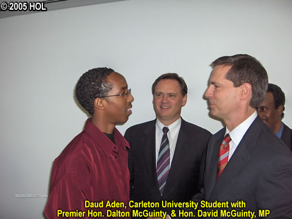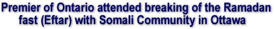 On October 28, 2005, the premier of Ontario Hon. Dalton McGuinty accompanied by his brother Hon. David McGuinty. MP, and the premier’s staff attended breaking of the Ramadan fast (Eftar) with the members of the Somali community in Ottawa. The premier was warmly welcomed by the community leaders who were present at the newly opened Assallam mosque in the premier’s riding in the Ottawa South.