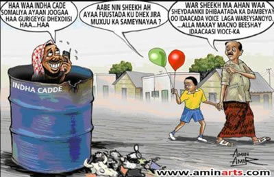 In the following picture by the famous Somali artist Amin Amir, we see illustrated the widely-held sentiment against the biased information the VOA Somali is providing. This picture shows Mr. Yusuf Indhacadde, one of the most wanted terrorist suspects in Somalia, speaking to the VOA Somali Service in Washington, saying, "Yeah! Yeah! This is Indhacadde, I am in Somalia, I am talking to you from my Mogadishu residence." The little boy walking by asks his father, "Look! There is Sheikh in the container, what is he doing in there?" The father replies, "No! That is not Sheikh; that is the big satin ‘Indhacadde,' who was behind the suffering of many Somalis, talking to the VOA in an interview. Oh! Now-a-days, the VOA has become a meaningless broadcast." Conclusion