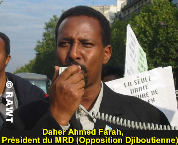 Mr. Daher Ahmed Farah, President of the MRD (Movement for the democratic Revival and Development), one of the principal legalized opposition parties in Djibouti Republic, will from September 21, 2006 pay a work visit of 72 hours in Canada, on the invitation of the Djibouti community of Canada and of Djib-Watch (organization which works for the human rights and the Democracy in Republic of Djibouti).