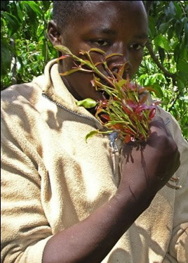 Kenyan farmer James Ntonyi chews khat leaves at his father's farm in Meru, 170 kilometres northeast of Nairobi, January 2006. Khat chewers are at greater risk of heart disease and liver damage, according to a paper published by Britain's Royal Society of Medicine, which says doctors should be trained to spot harm caused by this habit. |