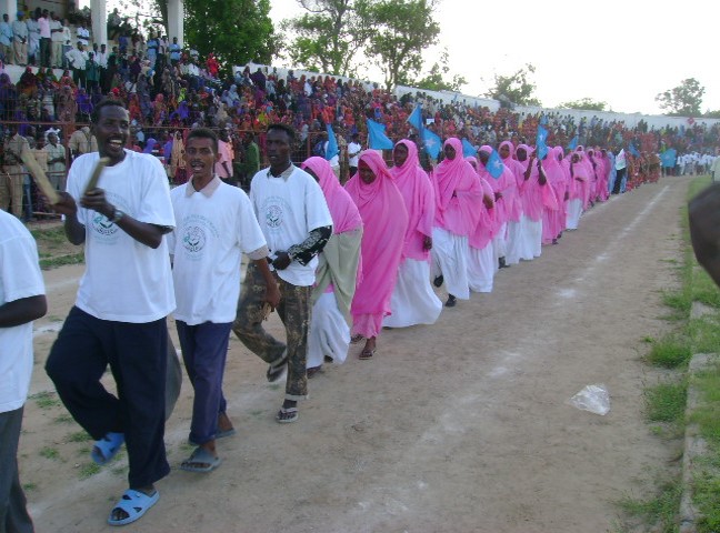 Inta badan dadkii ka soo qeyb galay isu soo baxa lagu taageeray shirweynaha dib u heshiisiinta Qaran waxay siteen funaanado ay ku xardhan tahay calaamada guddiga shirweynaha, waxaana Garoonka lagu soo bandhigay ciyaaraha hidaha iyo dhaqanka oo qaarkood ay ka qeyb qaateen madaxda sare ee gobolka Banaadir oo uu horkacayo guddoomiyaha ahna duqa magaalada Muqdisho Maxamed Cumar Xabeeb (Maxamed Dheere).