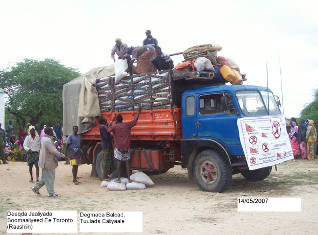 Khamiis, May 17, 2007(HOL): Ururka Samafalka Wadaniga ah ee Bani’aadam ayaa Deeq raashin ah waxaa uu guddoonsiiyay Dad ka barakacay Magaalada Muqdisho oo ku sugan Tuulooyin hoos yimaada Gobolka Shabeelaha Dhexe.