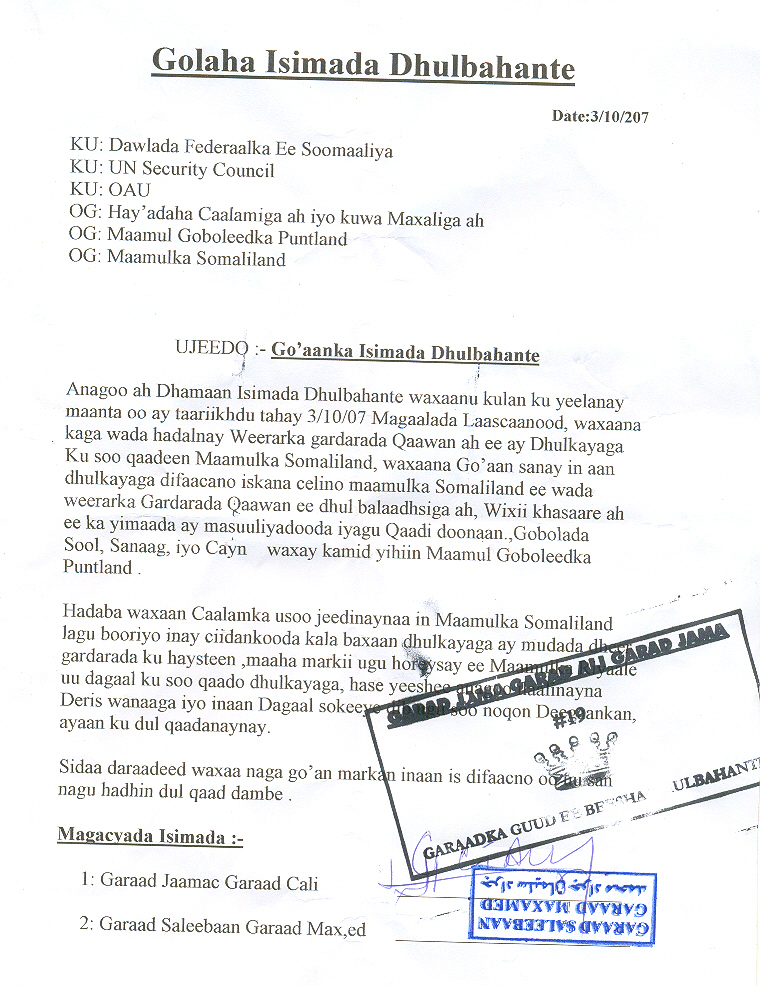 - Isimada Gobolka Sool oo Baaq ka soo saaray Xiisadda Somaliland iyo Puntland ugu dhaxeysa Gobolkaas