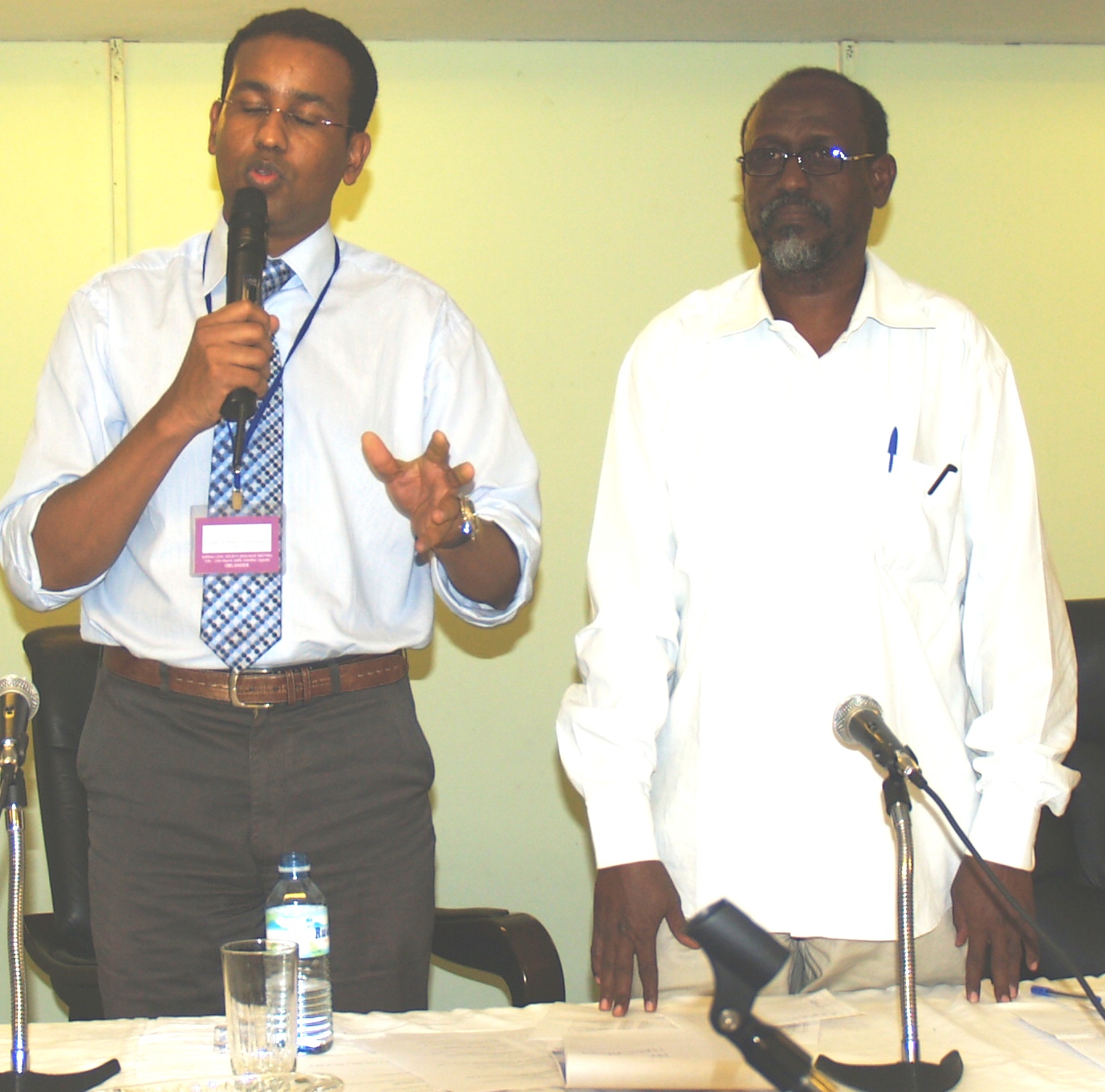 Agaasimaha Hay'adda CRD Jabriil Ibraahim Cabdulle(Bidix) iyo Guddoomiyaha Ururrada aan Dowliga ahayn ee Koofurta iyo bartamaha Soomaaliya Axmed Nuur Cusmaan