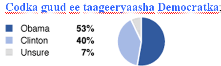 Jimco, May 30, 2008 (HOL) - Tartanka mudada dheer qaatay ee u dhaxeeya musharaxiinta xisbiga demoqraadiga ayaa waxa uu soo gaaray xilli Senator Barack Obama u muuqdo musharaxa Xisbiga Dimoqraadiga