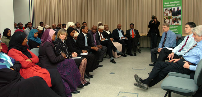 Cardiff, Wales - Wasiirka Arrimaha debada ee dalkan Britain Hon David Miliband MP ayaa kulan gaar ah oo aad u balaadhan  manta la yeeshay Jaaliyada Somaliland eek u dhaqan Gobolka Wales gaar ahaan caasimada gobolkaas ee Cardiff, Kulankan oo ay kasoo qayb galeen boqolaal ka tirsan jaaliyada Somaliland iyo ururrada Bulshada, Dhalinyarada, Madaxda iyo Waxgardaka Bulshada, eek u dhaqan gobolkaasi  iyo waliba Wasiirka  koowaad ahna badhasaabka gobolka Wales Rt. Hon Mudane Rhodri Morgan AM iyo Mudane Alun Mikchal MP oo ka tirsan Baarlamaanka dhexe ee Britan  isla markaasna ah Gudoomyaha gudiga Baarlamaanka UK ee Somaliland oo u ololeeya qadiyada Somaliland.