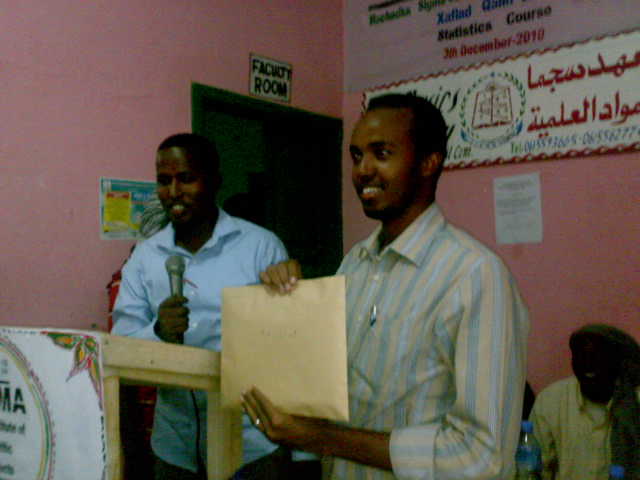 Jimco, 3, Dec, 2010 (HOL) Munaasabad siweyn loo soo agaasimay ayana ka soo qeyb-galeen Macalimiinta dugsiyada magaalada Beledweyne, Aqoonyahano, Ganacsato, Waalidiin, Ardey, iyo waxgarad kale taasoo lagu gudoonsiinayay shahaado arday ka qalin Jabisay Koorso lagu baranayay ''Statistics'' ayaa lagu qabtay gudaha machadka oo ku yaala magaalada Beledweyne.