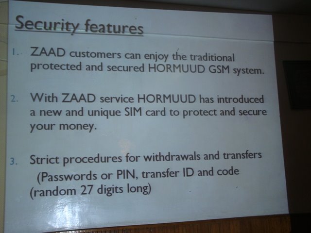 Talaado 23, Feb 2010 (HOL) Iyadoo dhawaan Shirkadda Isgaarsiinta HORMUUD TELECOM ay soo bandhigtay adeeg casri ah oo loo bixiyay ZAAD SERVICE oo ah adeeg dabooli kara baahida guud ee bulshada ayna u adeegsan karaan adeegooda gaarka ah iyo keysiga lacagahooda biilasha ah ayaa waxay shirkadu wali ku jirtaa sidii ay shacabka Soomaaliyeed u fahamsiin lahayd faa'iidada uu adeeggan leeyahay.