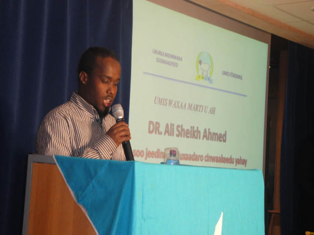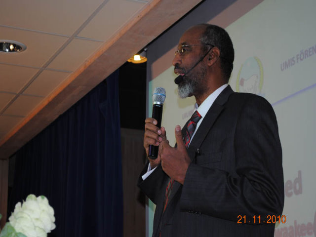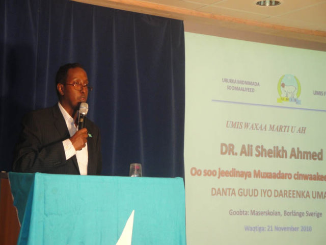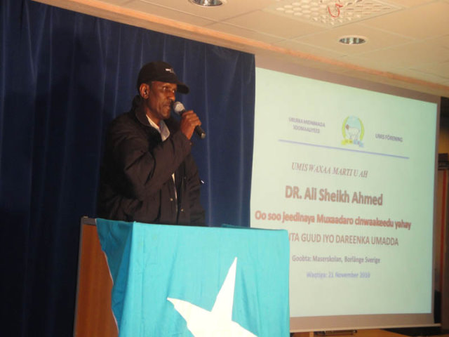 Talaado, November 23, 2010(HOL): Dr. Cali Sheikh Ahmed oo ah gudoomiyaha Jaamacada Muqdisho ayaa dhawaanahan wuxuu booqosho ku marayey qaar ka mid ah wadammada ku yaalla waqooyiga yurub, gaar ahaan Scandenevia; hadaba bulsho-weynta ku dhaqan Dalka Sweden waxay nasiib u heleen in ay la’ kulmaan isla markaana ka faaiideystaan Dr. Cali, iyadoo fursadaha noocaas oo kala ah ay aad ugu weyn tahay bahda had iyo jeer jecel ama danaysa waxbarashada iyo Iftiinka aqoonta.